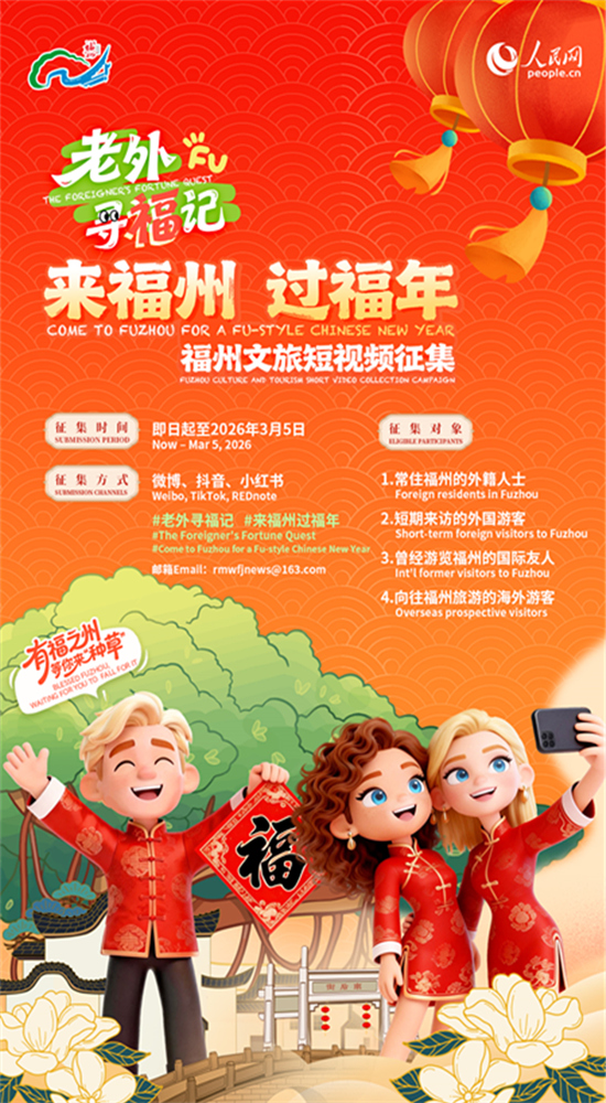 有福之州,温暖榕城!福州的“福”气,不止藏在三坊七巷的青石板里,不止泡在鱼丸肉燕的滚烫汤头中,也藏在每一位外国朋友惊喜的眼眸里。即日起至2026年3月5日,福州市文化和旅游局联合人民网推出“来福州,过福年”福州文旅短视频征集活动,向所有与福州结缘的国际友人发出盛情邀约。
