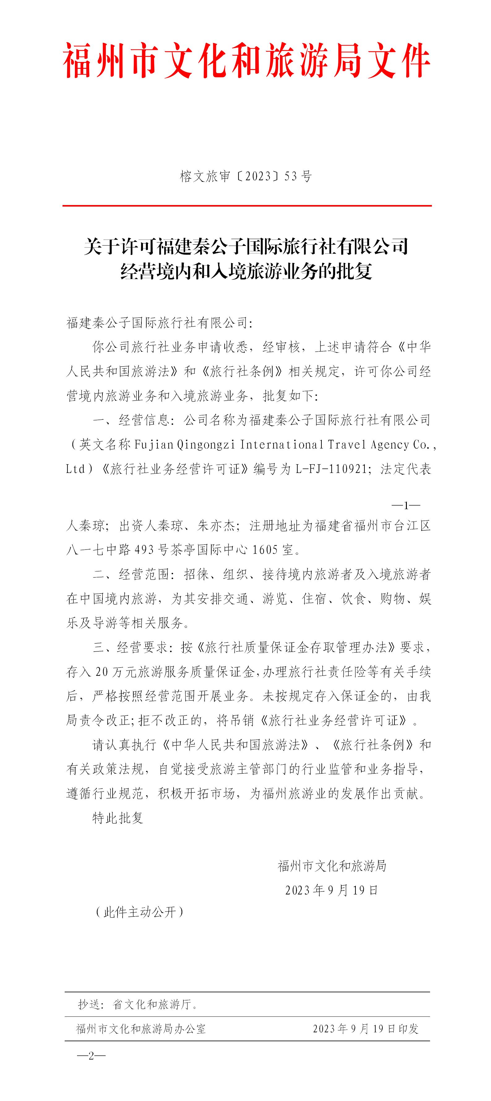 榕文旅审〔2023〕53号 关于许可福建秦公子国际旅行社有限公司经营境内和入境旅游业务的批复