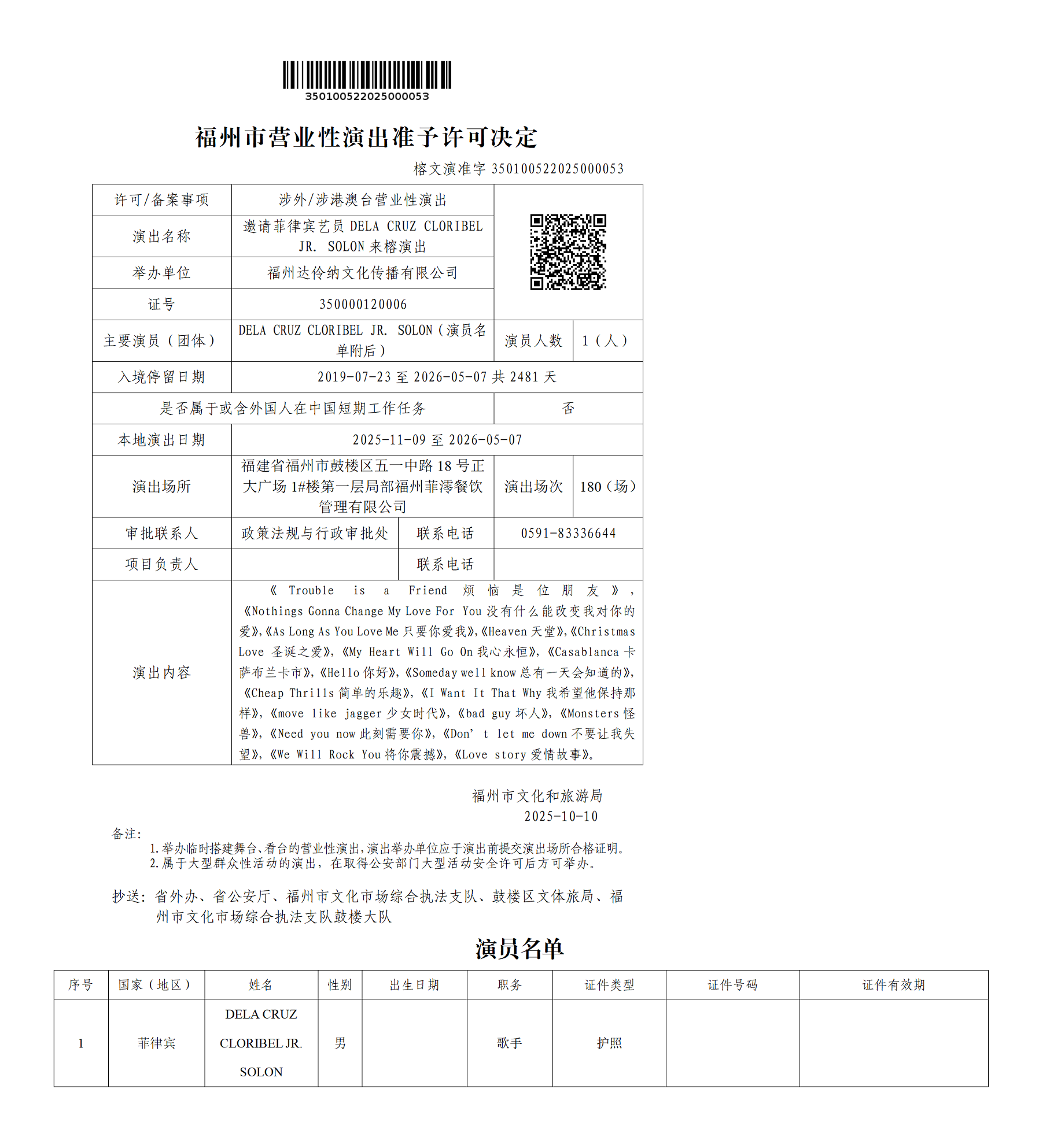 福州市营业性演出准予许可决定(榕文演准字350100522025000053)