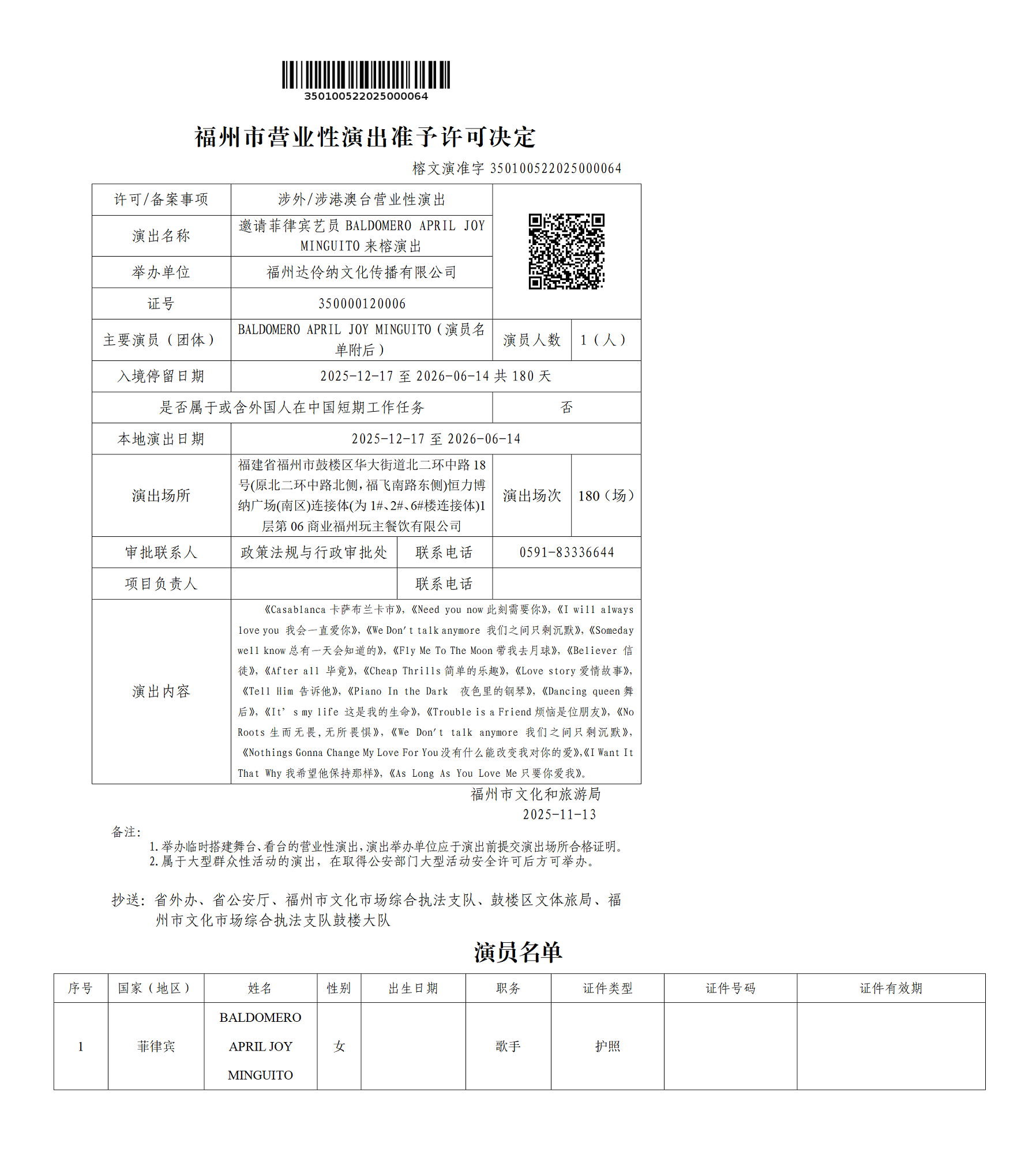 福州市营业性演出准予许可决定(榕文演准字350100522025000064)