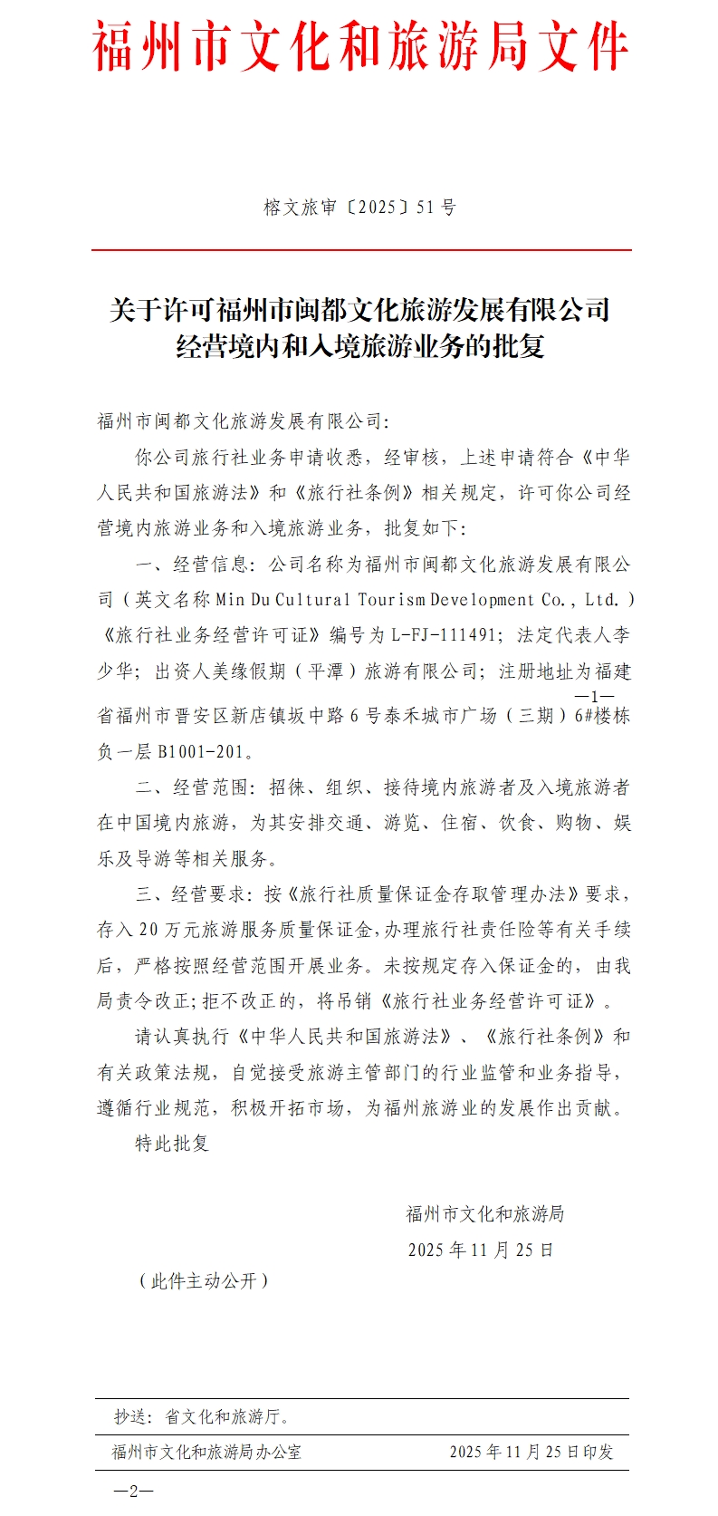 榕文旅审〔2025〕51号 关于许可福州市闽都文化旅游发展有限公司经营境内和入境旅游业务的批复