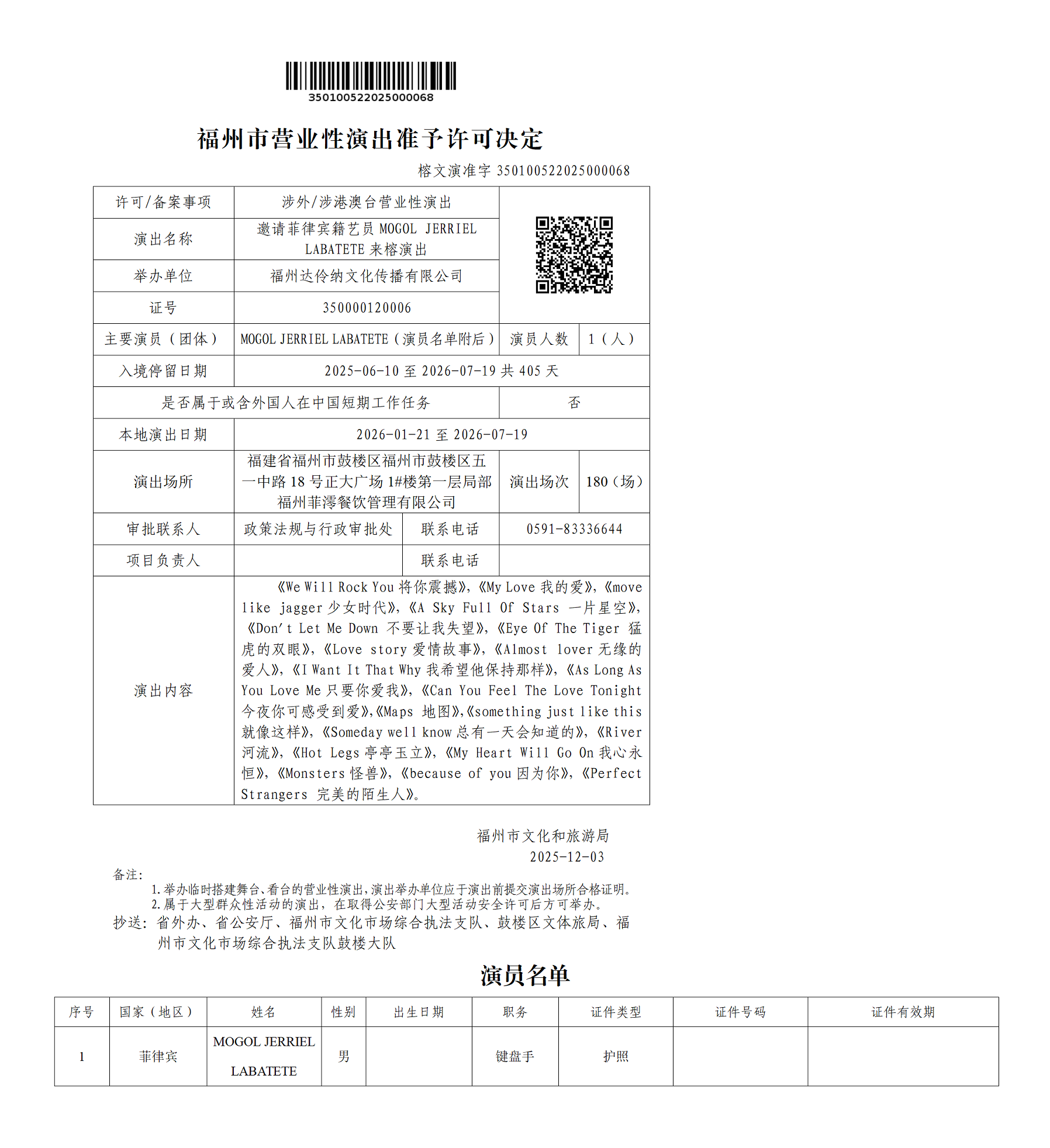 福州市营业性演出准予许可决定(榕文演准字350100522025000068)