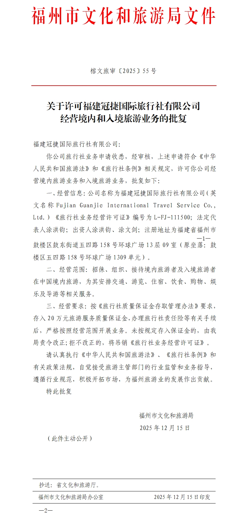 榕文旅审〔2025〕55号 关于许可福建冠捷国际旅行社有限公司经营境内和入境旅游业务的批复