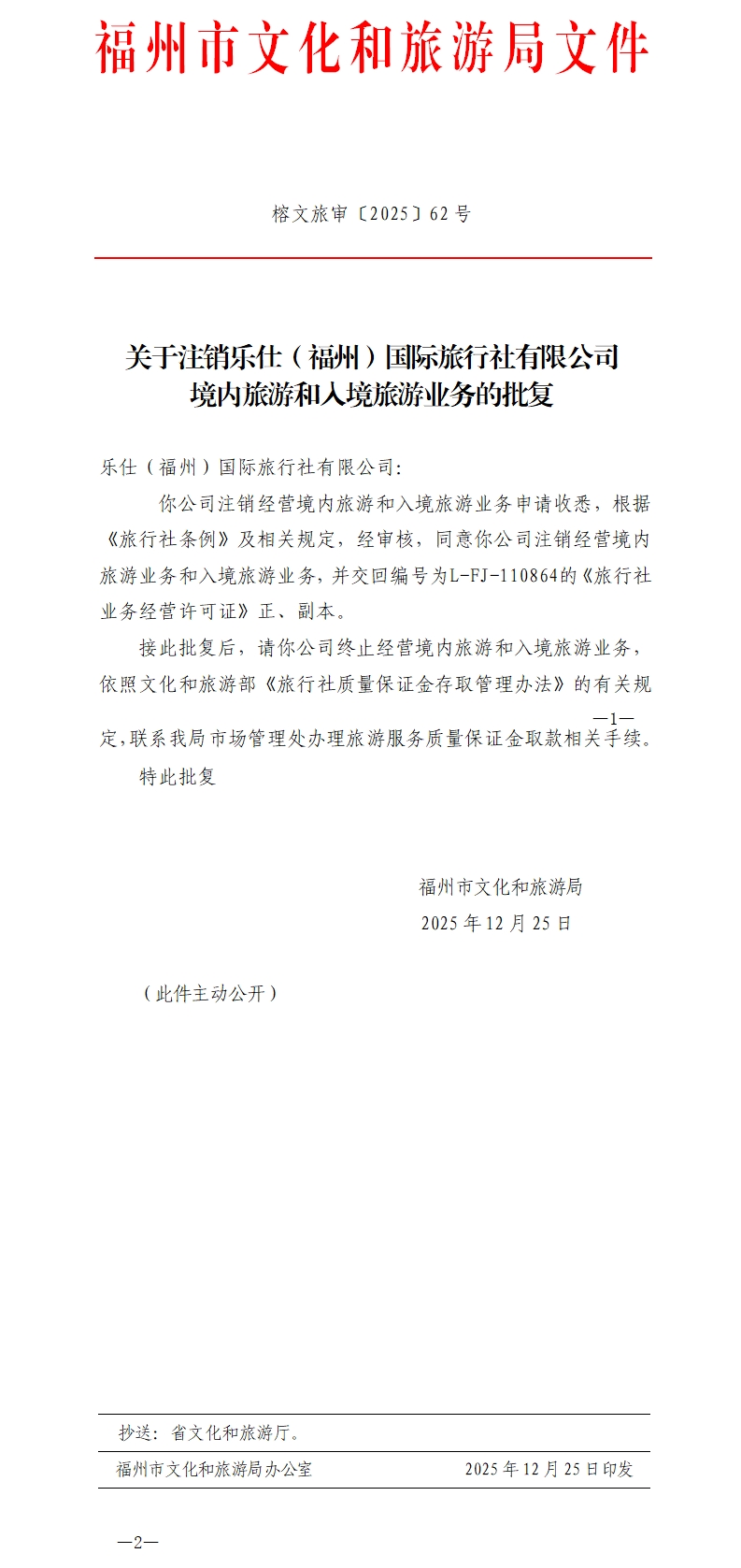 榕文旅审〔2025〕62号关于注销乐仕(福州)国际旅行社有限公司境内旅游和入境旅游业务的批复