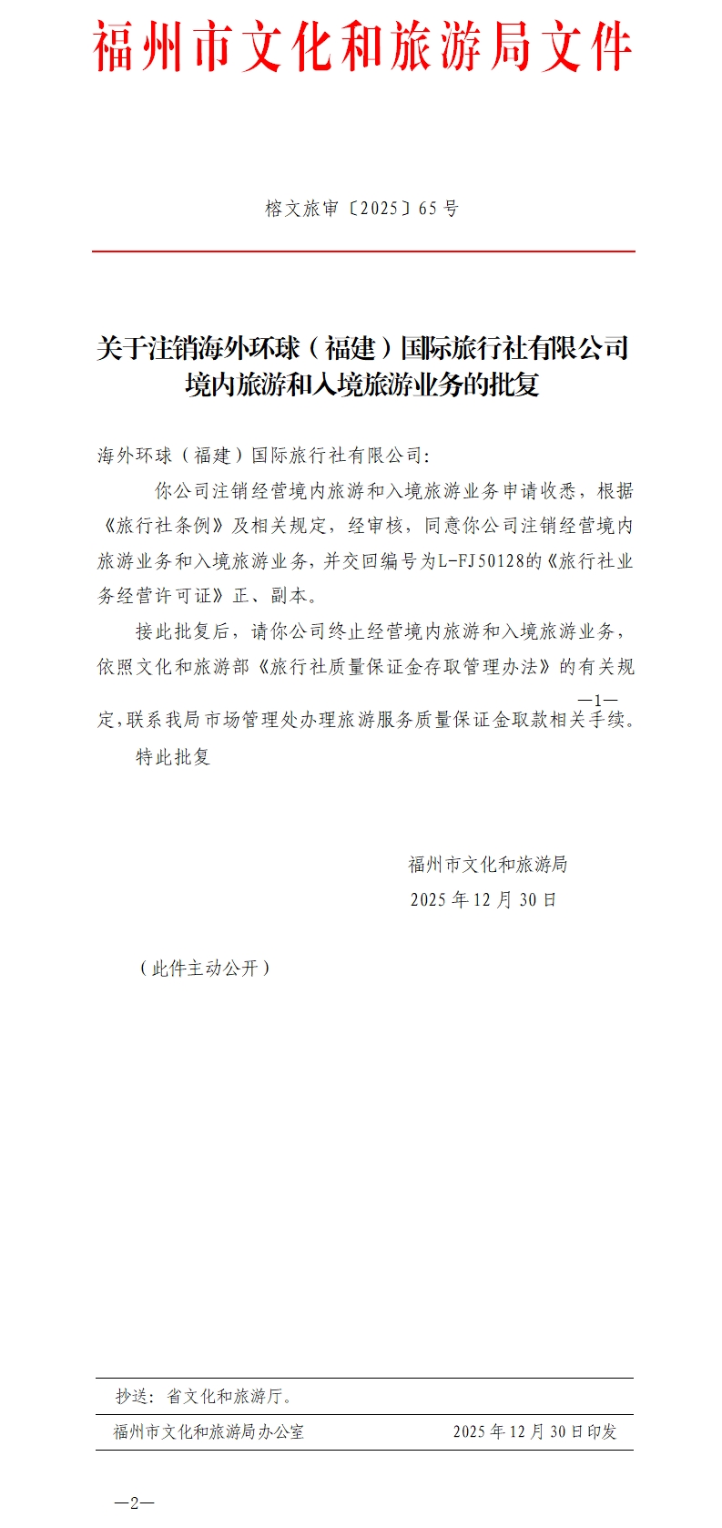 榕文旅审〔2025〕65号关于注销海外环球(福建)国际旅行社有限公司 境内旅游和入境旅游业务的批复