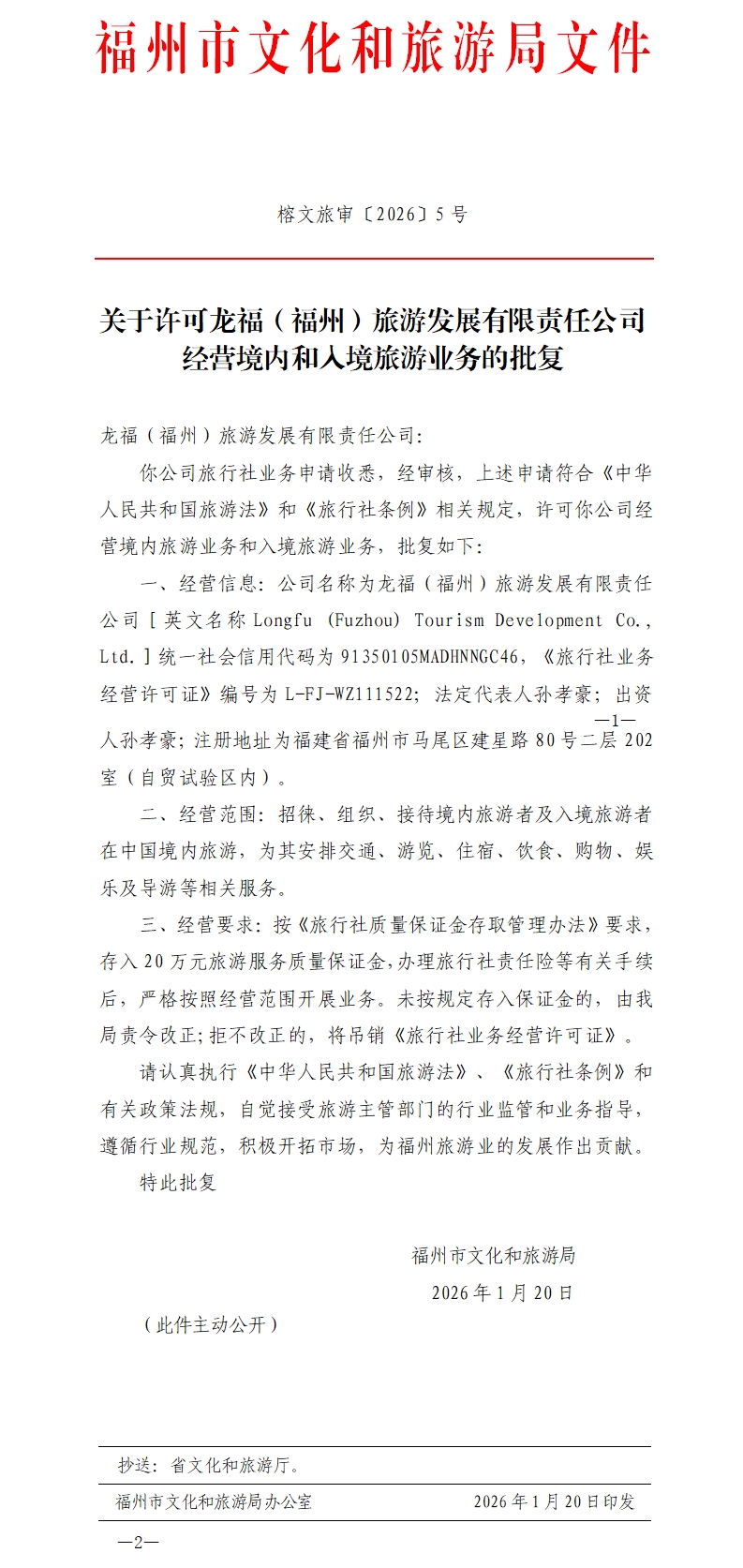 榕文旅审〔2026〕5号 关于许可龙福(福州)旅游发展有限责任公司经营境内和入境旅游业务的批复