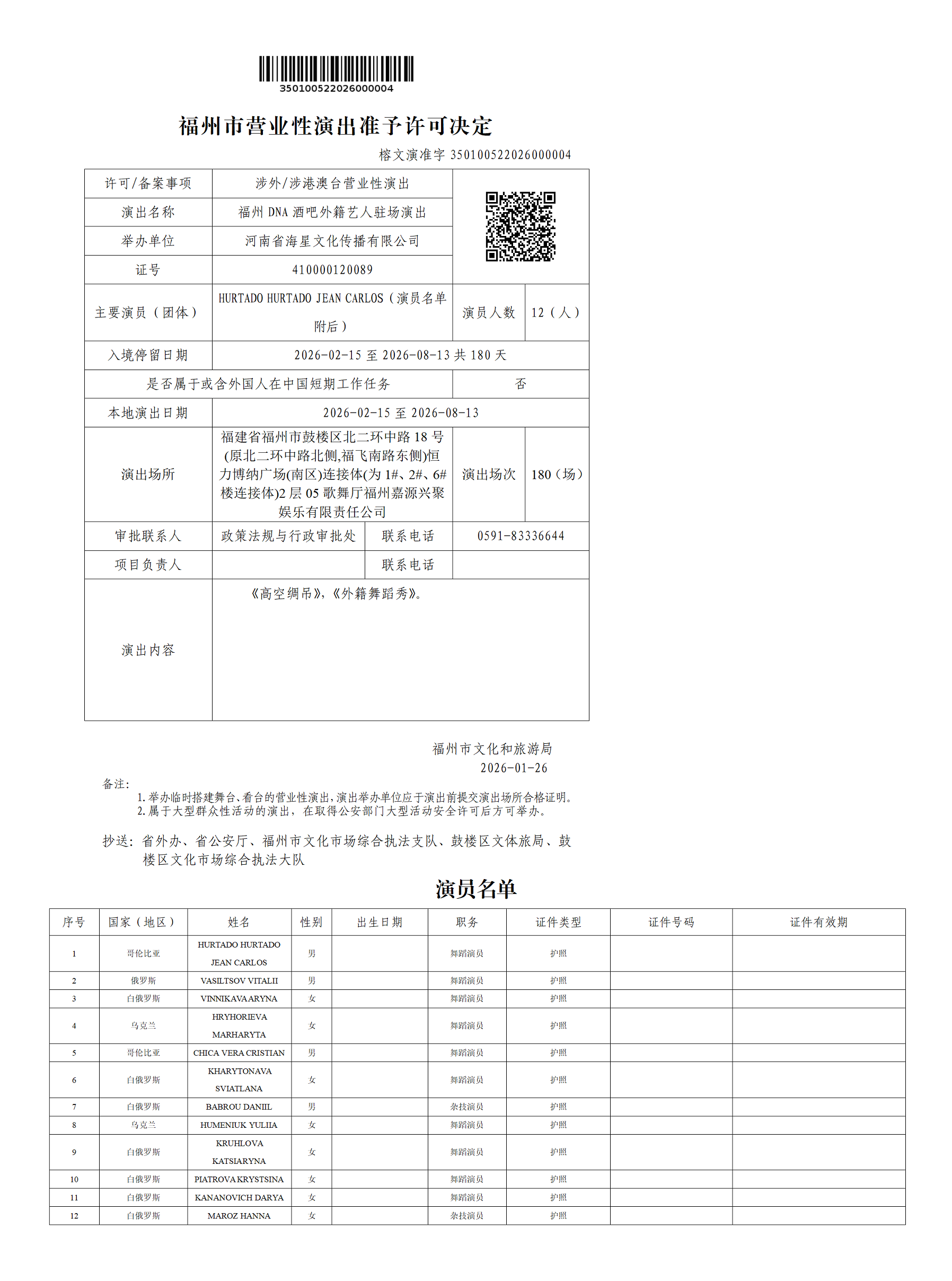 福州市营业性演出准予许可决定(榕文演准字350100522026000004)