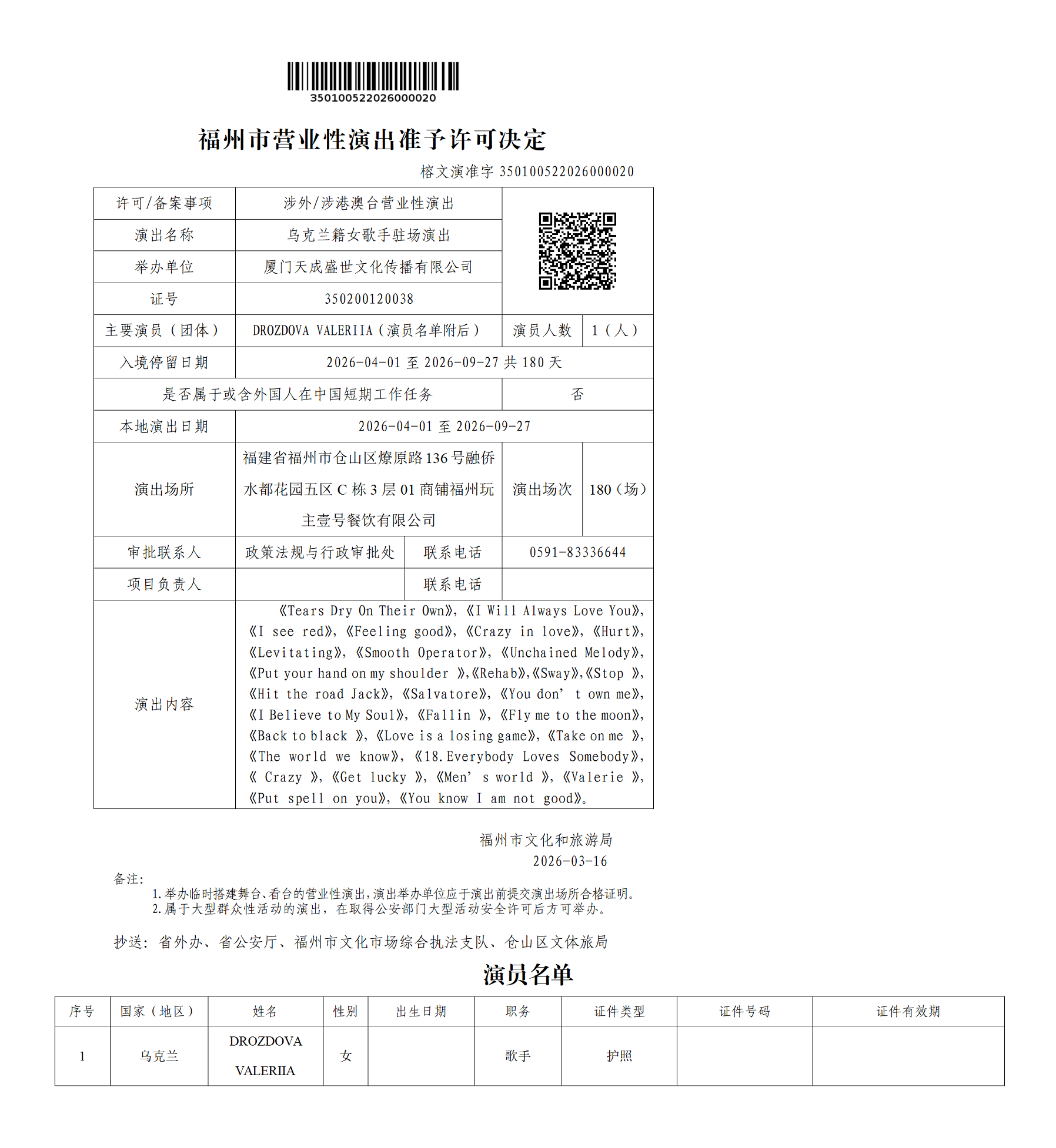 福州市营业性演出准予许可决定(榕文演准字350100522026000020)