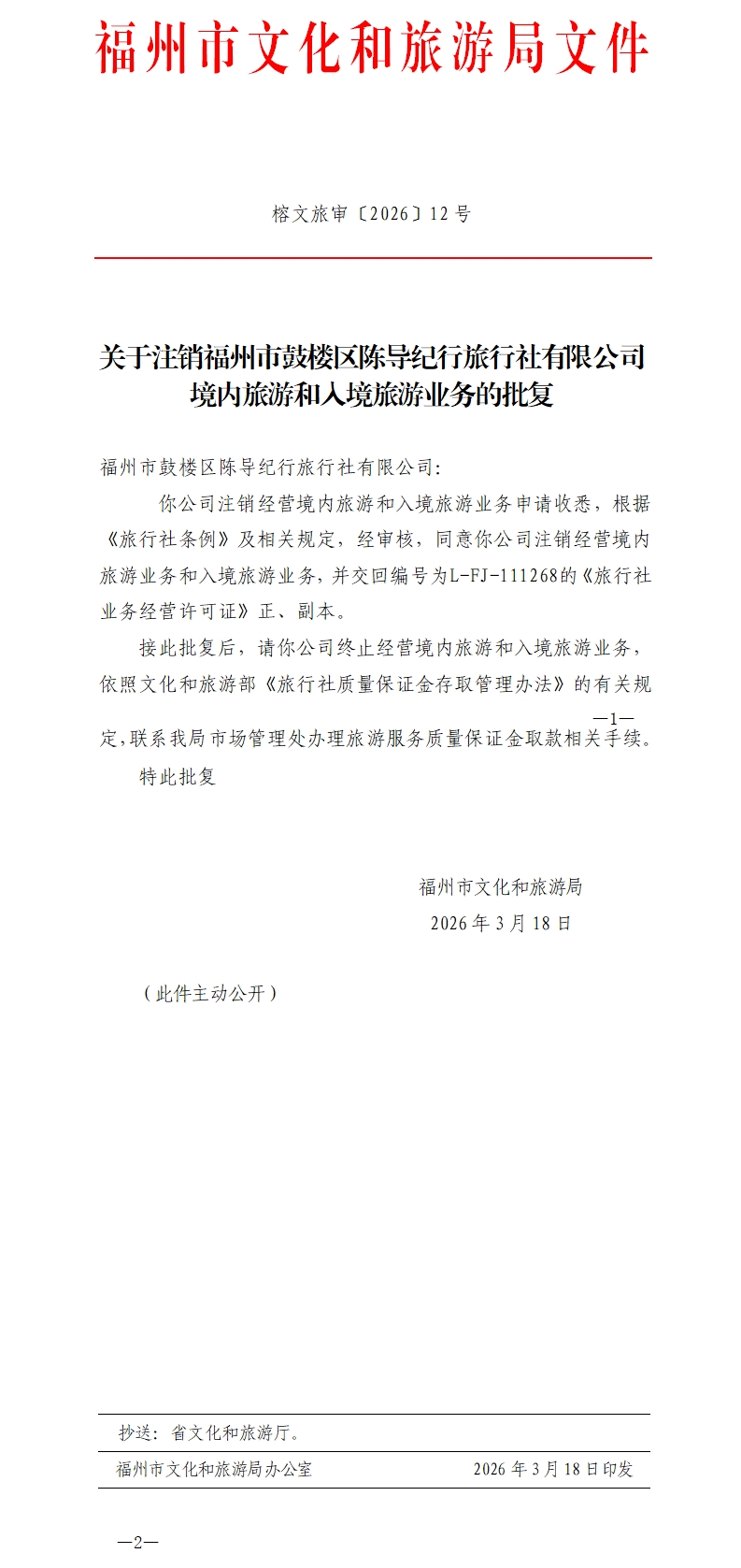 榕文旅审〔2026〕12号 关于注销福州市鼓楼区陈导纪行旅行社有限公司境内旅游和入境旅游业务的批复