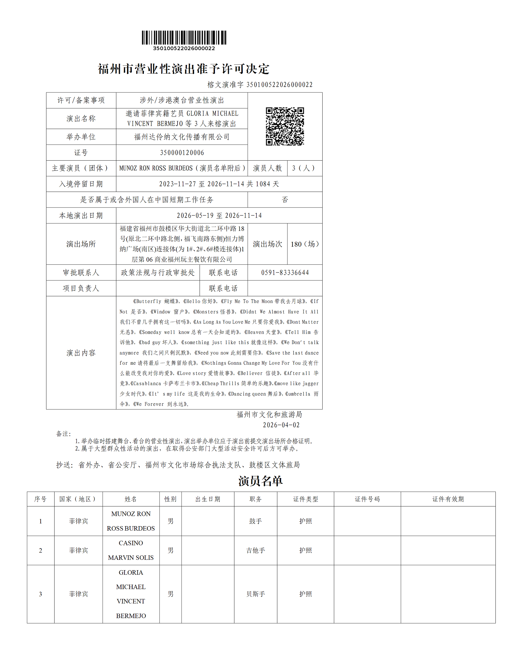 福州市营业性演出准予许可决定(榕文演准字350100522026000022)